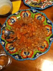 One great thing about the Foreign Service is that we’re meeting people from all over the world. Last week, a woman with whom I worked in Tashkent was in town visiting and she invited us over to her friend’s house for plov. Plov is the national dish of Uzbekistan and it is similar to a rice pilaf. Rice is the base ingredient, along with bite-sized pieces of meat (usually mutton), carrots, and lots of oil. Variations include additional ingredients, such as chickpeas, but few changes are made to the basic dish no matter where it is served. It is often served with a salad of thinly sliced tomatoes, onions, and cucumbers.
