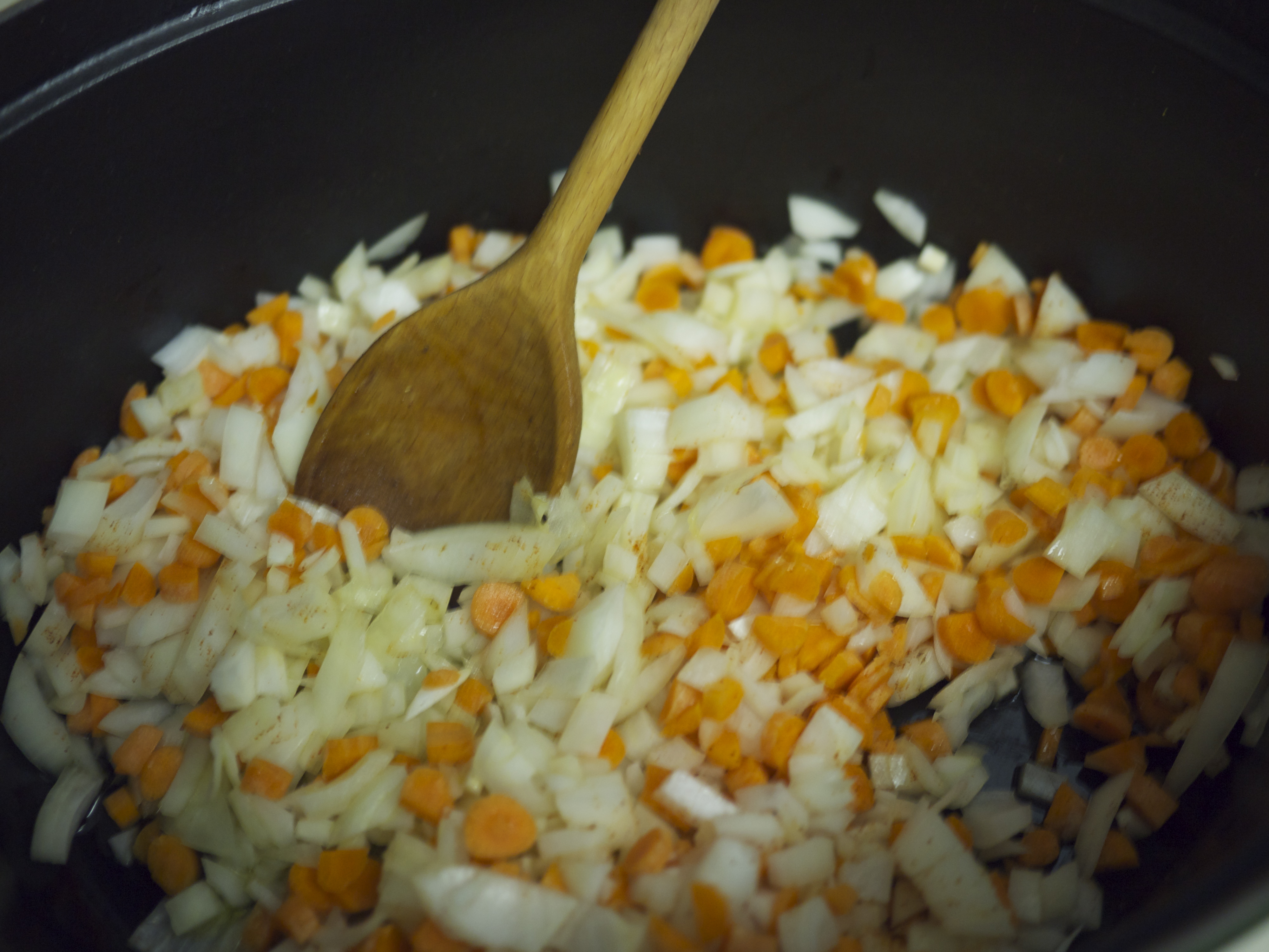 - In a Dutch oven or wide soup pot over medium-low heat, warm the olive oil. Add the onions, carrots, 3 tablespoons of the parsley, and the cayenne. Cover and cook, stirring occasionally, until the vegetables are well softened, about 10 minutes.