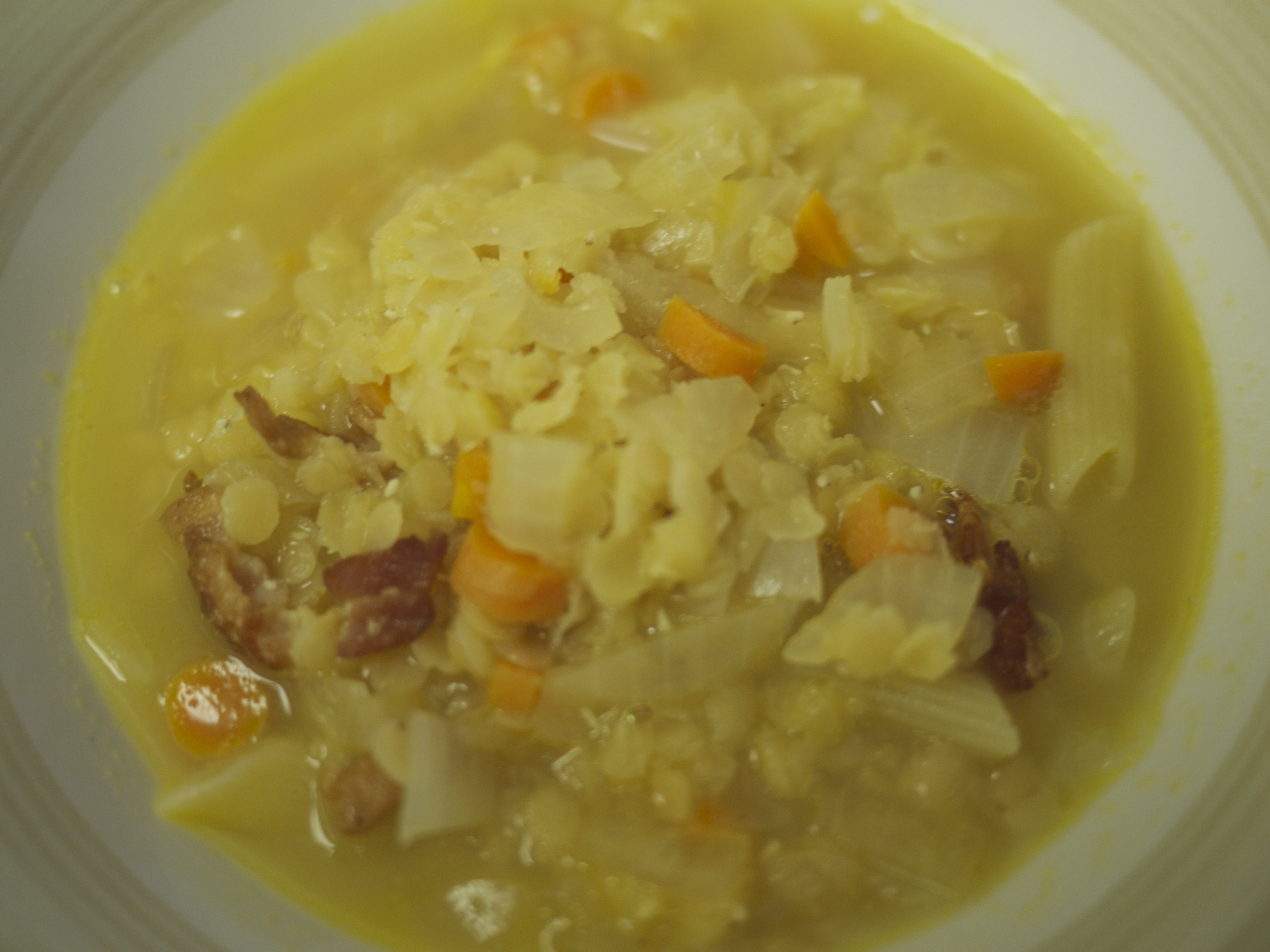 When we got married, we didn’t ask for any cookbooks; fortunately, we received them anyway (otherwise, I’m sure I wouldn’t have encountered the recipe for this dish!). While I tend to find most recipes online, it is really fun to go through cookbooks and, oftentimes, I find recipes to make that weren’t even on my radar screen. The best example is Williams-Sonoma’s The Pasta Book, by Julia Della Croce. We made many of these recipes (or variants of them) during our first year of marriage, in Uzbekistan. One of our favorites ended up being the red lentil soup with farfallette, which we would make and then eat for lunch for most of the rest of the week.