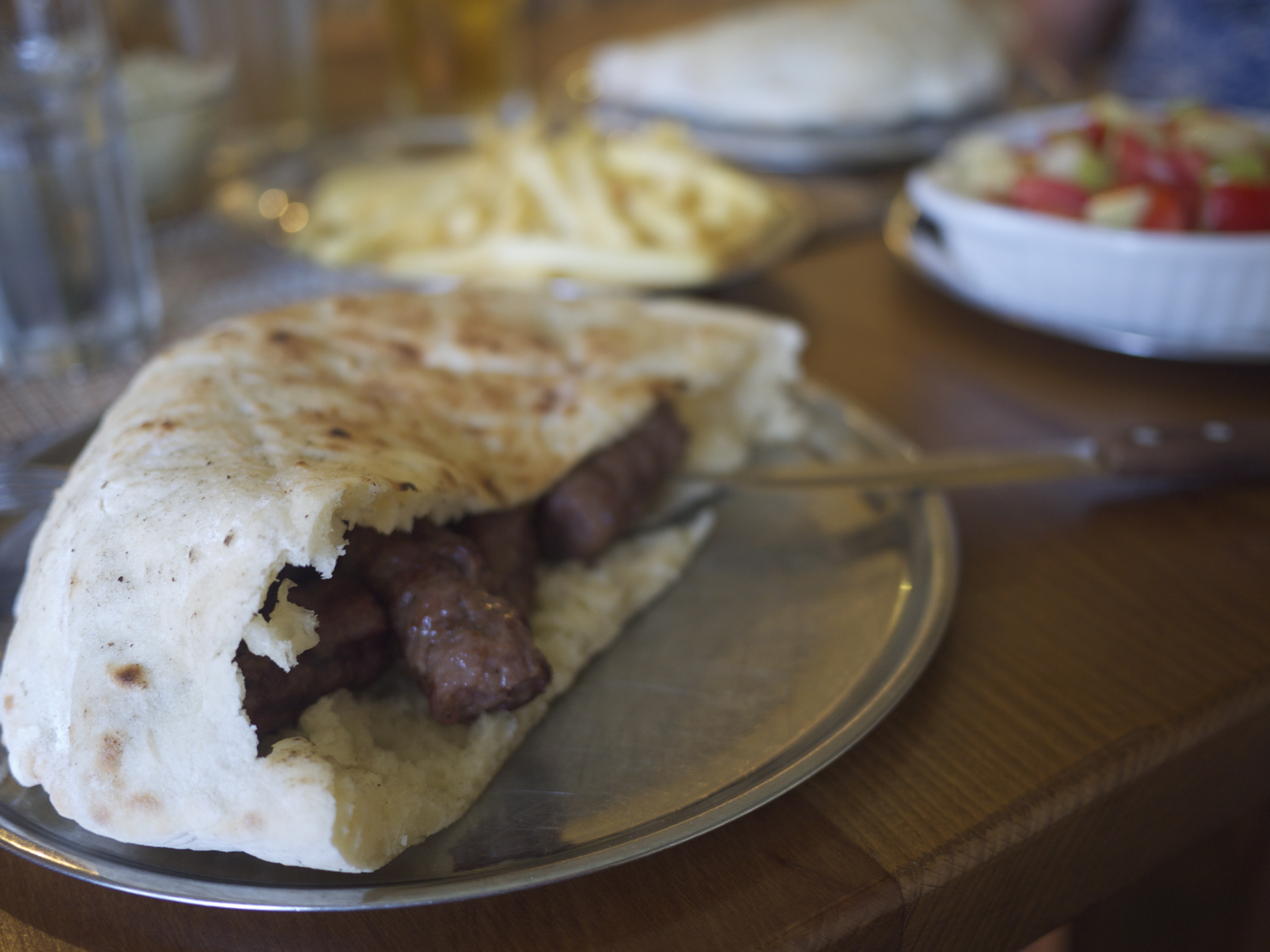 I recently had my first taste of Serbian food — and it was delicious. We went to this hole-in-the-wall place downtown that Grant had previously been to, and as we were on the early side, we had the place nearly to ourselves. We had the very traditional, very Serbian ćevapi. Grilled ground meat, but nothing like a hamburger; it looks more like small sausages, and they are stuffed into a piece of bread similar to pita.